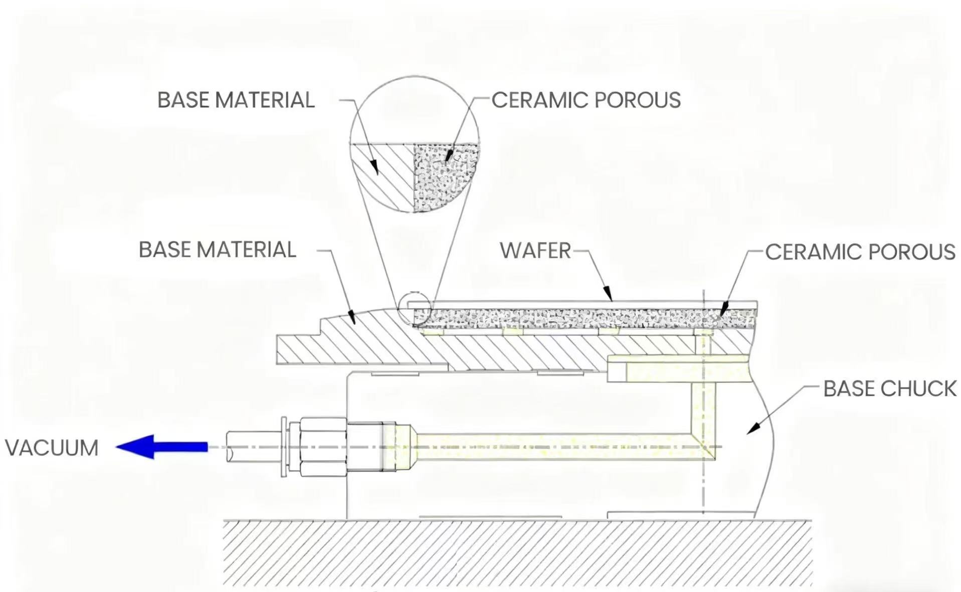 Personnalisémandrin en céramique poreusecomprend la base et la plaque en céramique poreuse. Connecté à un système de vide, l'environnement basse pression est créé en évacuant l'air entre la plaquette et la céramique. Sous pression négative sous vide, la plaquette adhère fermement à la surface du mandrin, permettant ainsi une fixation et un positionnement sûrs et stables.