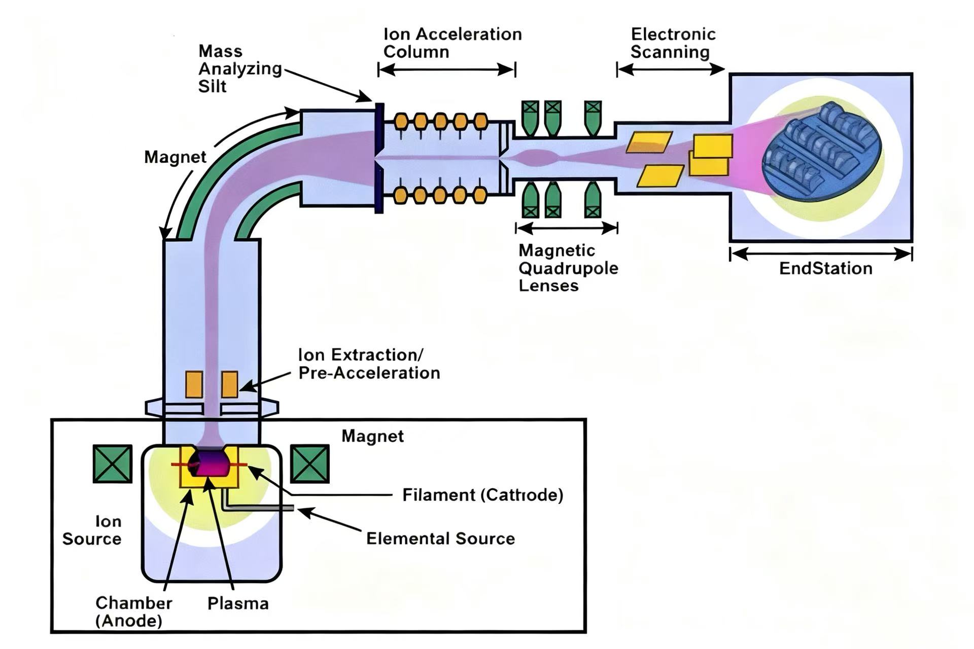 2. L'implantation ionique est la principale technique de dopage dans la fabrication de semi-conducteurs, qui présente plusieurs avantages, tels qu'une précision de dopage élevée, de faibles températures de processus et peu de dommages au matériau du substrat. Plus précisément, le processus d’implantation ionique consiste à ioniser des atomes d’impuretés pour créer des ions chargés, puis à accélérer ces ions via un champ électrique de haute intensité pour former un faisceau d’ions de haute énergie. La surface du semi-conducteur est ensuite frappée par ces ions en mouvement rapide, permettant une implantation précise avec une profondeur de dopage réglable. Cette technique est particulièrement utile pour créer des structures de jonction peu profondes, telles que les régions de source et de drain des MOSFET, et permet un contrôle de haute précision sur la distribution et la concentration des impuretés.