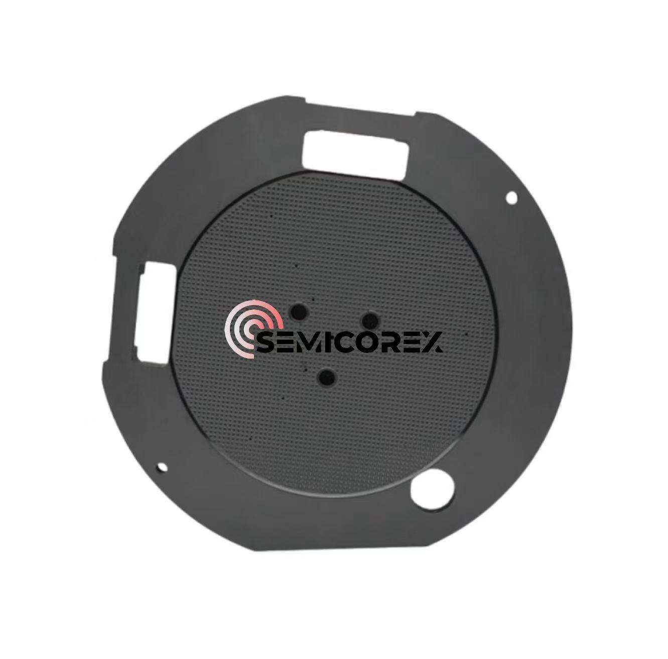 Des micro-trous conçus avec précision sont uniformément répartis sur la surface des mandrins à vide en céramique SiC, permettant une connexion fiable à l'équipement de vide externe. Pendant le fonctionnement, la pompe à vide est activée pour aspirer l'air à travers les trous, créant ainsi un environnement de pression négative entre la plaquette semi-conductrice et le mandrin à vide. Cela permet donc à la plaquette d'être maintenue uniformément et fermement sur la surface du mandrin à vide.